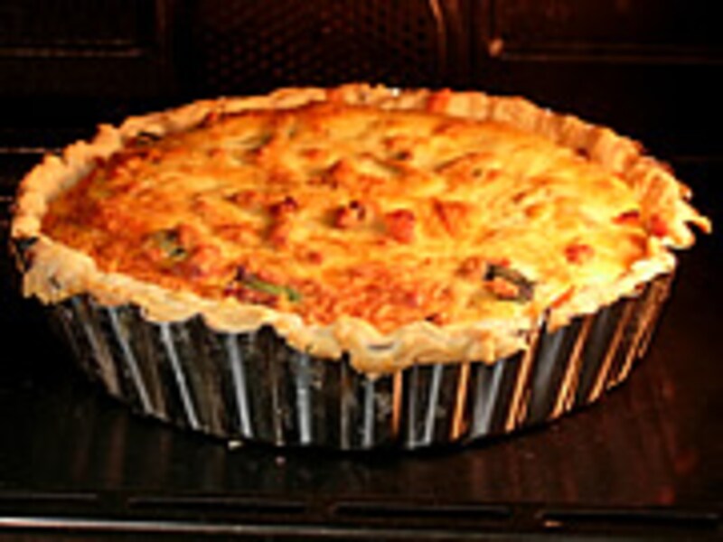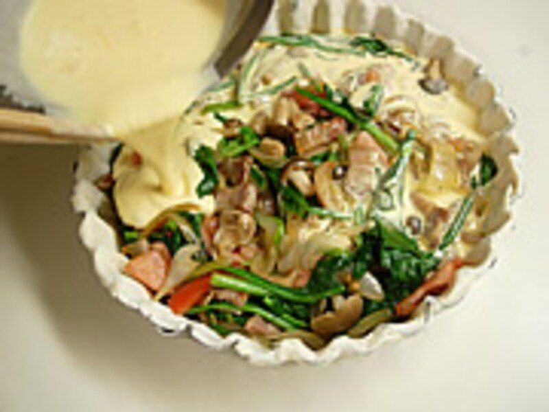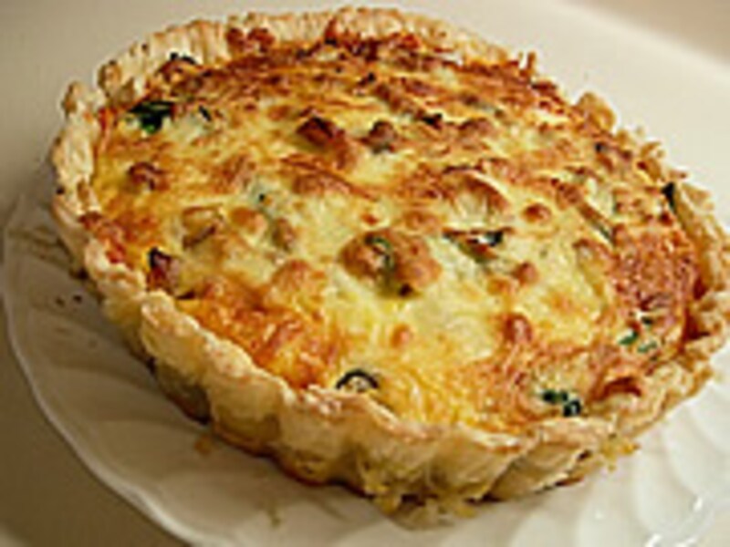 サクッとしたパイ生地に炒めたベーコンやほうれん草などの野菜を卵とチーズで焼き上げたキッシュ。