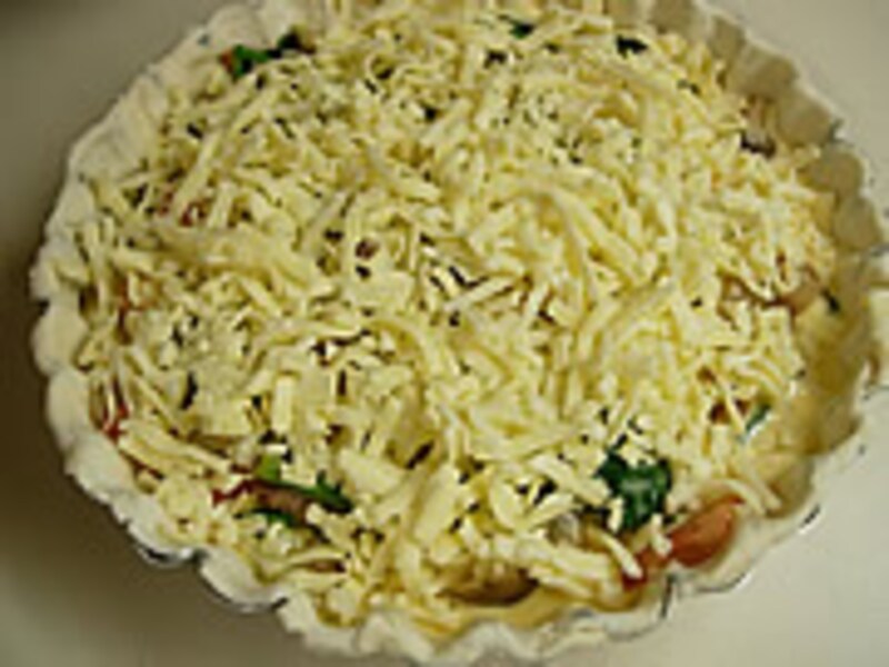 | 5・パイシートの上に冷えた具を入れ上から卵液を回しかけます。 | 6・ピザ用のとろけるチーズを全体に振りかけます。 | |