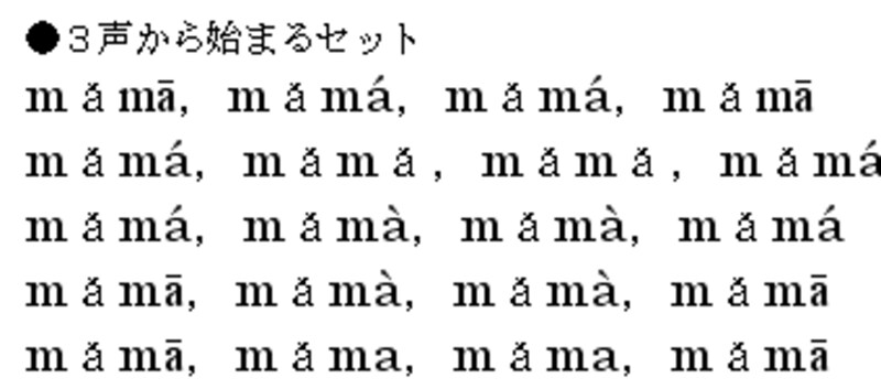 これらの声調組み合わせセットを、リズミカルにポンポンと読みましょう。