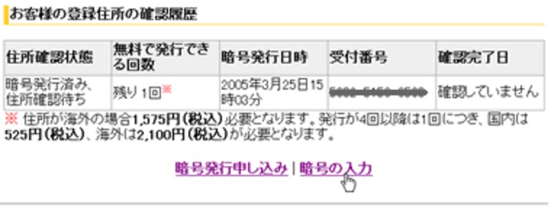 <<ポイント>>郵送住所確認は無料?日本国内であれば、日本のどこであろうと無料で暗号が書かれた郵送住所確認ハガキを郵送してもらえます。ただし、引っ越しなどで1年間に4回目以上の場合、4回目以降、国内は525円(税込)がかかります。 日本以外に住んでいるときは1575円かかりますが、こちらも申込からさかのぼって1年間で3回までが1575円で、それ以降は2100円が必要になります。 |