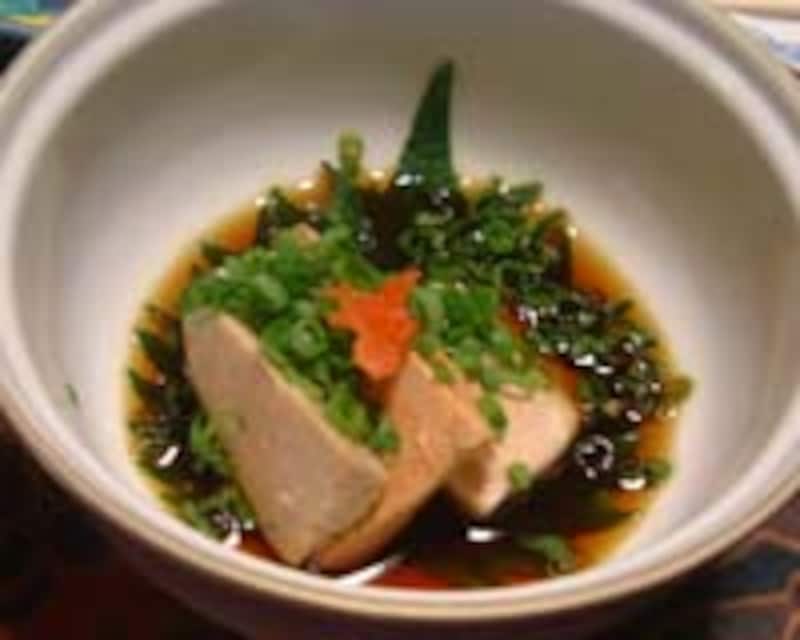 | アンコウの共酢。湯がいた身やアン肝に、アン肝と酢味噌を混ぜた共酢をかけていただく。酒呑みにはたまらない逸品。 |