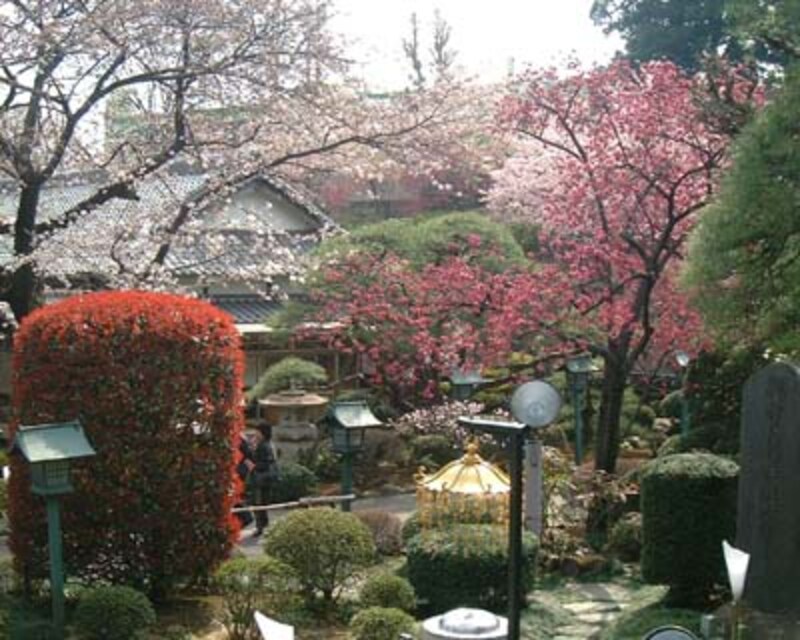 山門は大名家であった島津家江戸屋敷の門を移したもので、堂々たる風格を偲ばせます。また、庭園の美しさはすばらしく、桜も安行桜だけでなく、ソメイヨシノや、枝垂れ桜の巨木もあり、それぞれ開花が少しずつずれるいるため、3月下旬から4月半ば近くまで桜の饗宴を楽しむことができます。