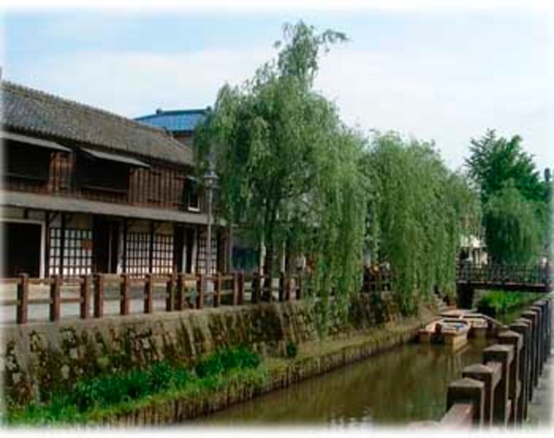 細い川沿いには江戸時代から昭和初期にかけての建物が建ち並び、荷揚げ場であった「だし」が残り、女船頭がこぐサッパ舟が浮かんで、かつての河港の面影を偲ばせます。
