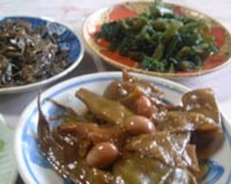 | 「おかず」(1テーブル200円)は毎日メニューが変わる。煮豆や漬物もおいしい。スローフードというよりまさに田舎のおかずだ。 |