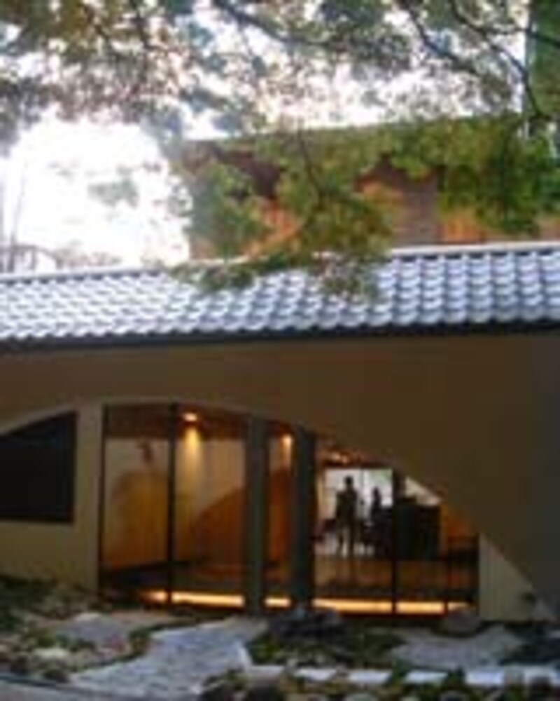 | 伊香保露天風呂へ向かう途中の古い街並みにモダンな外観が突然現れる「風の谷」 |