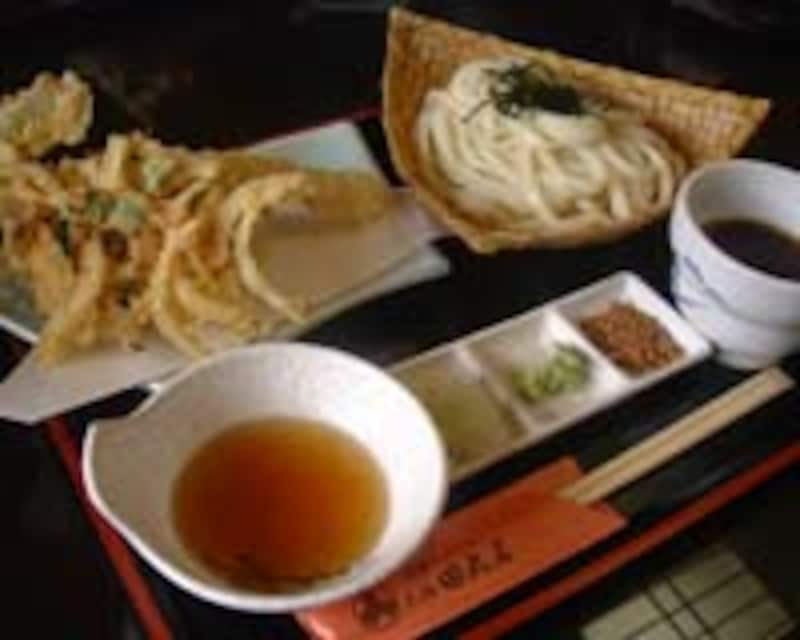| ガイドの好きな水澤うどん「田丸屋」。胡麻だれとしょう油たれの2種類を選べる。 |