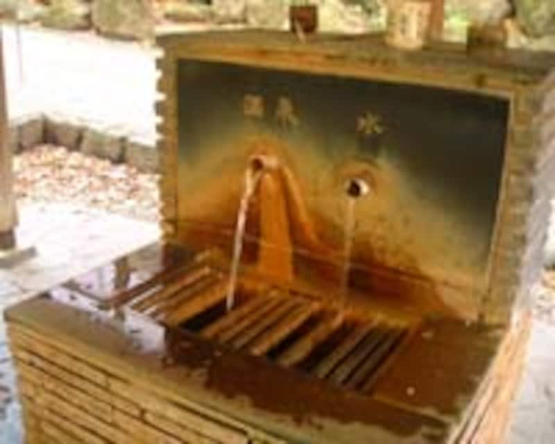| 源泉脇には飲泉所もあり。鉄分が多いのでかなり金気臭いが、カラダにはいい。湯を飲んだあとは隣の湧水をいただこう |