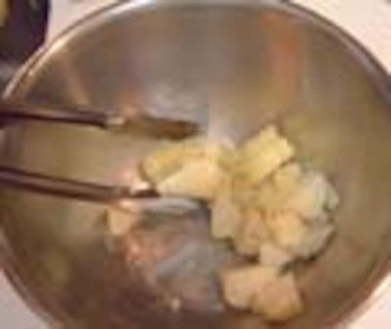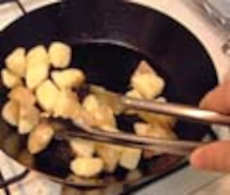 3.フライパンを熱しサラダオイルを引いたら、切り分けたジャガイモを入れ、中火で香ばしい焦げ目がつくぐらいに炒める。