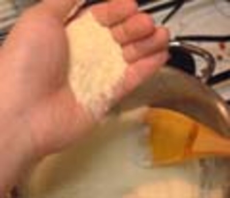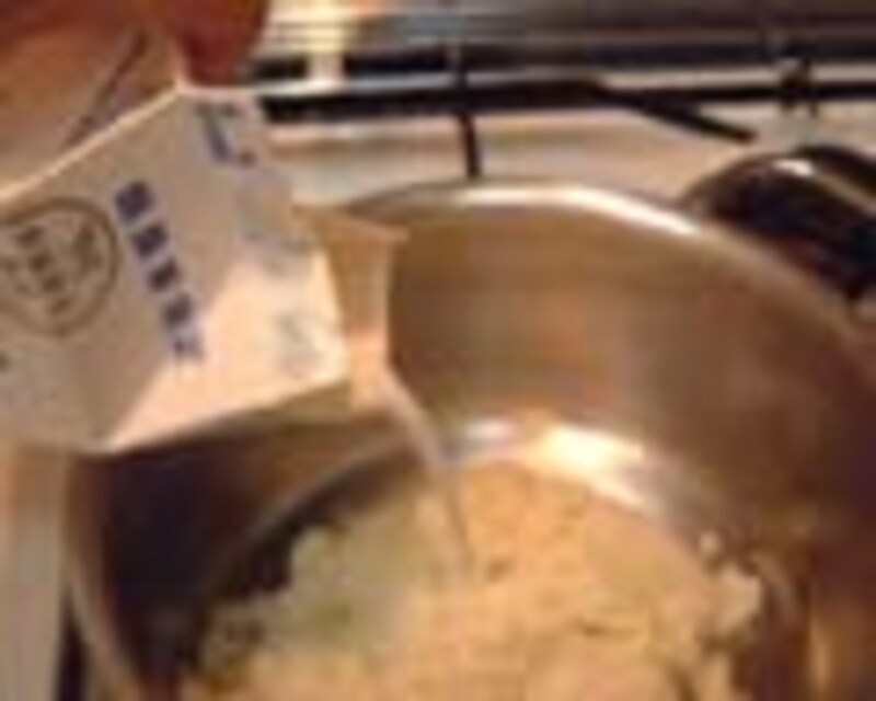 3.裏ごしをしたジャガイモを、ナベにいれて弱火にかけたら、全体をまぜながら少しづつ牛乳を加えて柔らかくのばしていく。最終的にグラタンに使うホワイトソースぐらいの柔らかさになるまで牛乳を加える。