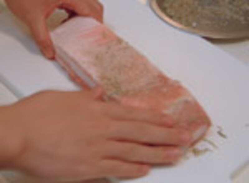 次にスパイス入りの粗塩を肉全体にしっかりとすり込んだ。
