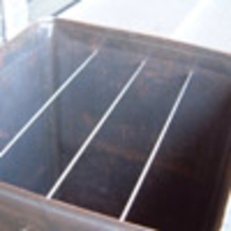 これに、バラ肉をぶらさげるための金串をつけるために、上部6カ所に穴をあけて串を通した。