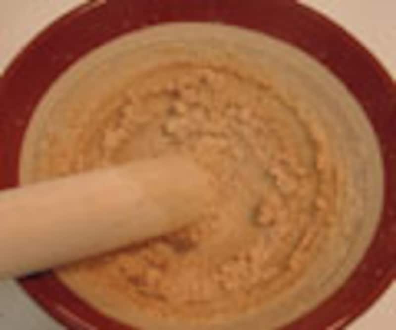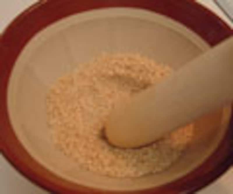 1. 白胡麻を軽く煎ってから、すり鉢に入れて、しっかりと擂る。