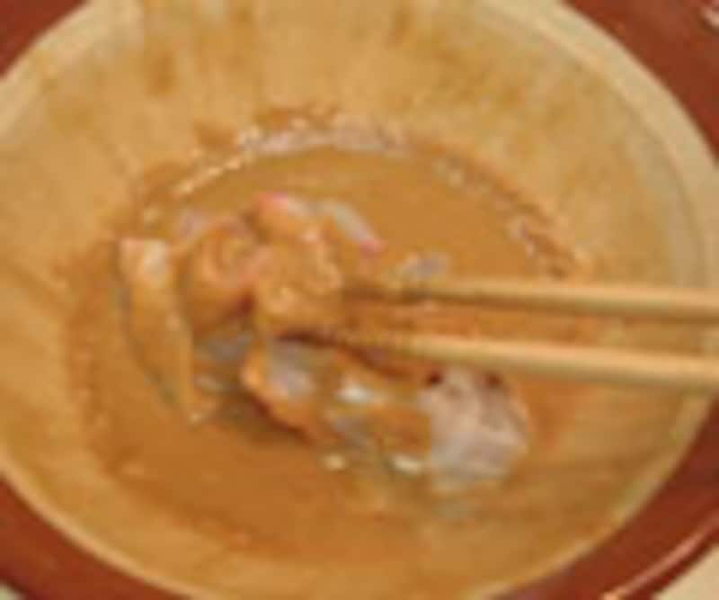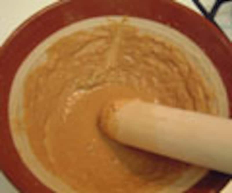 4. 次に、濃い口醤油を少しづつ加えながら、擂り合わせていく。
