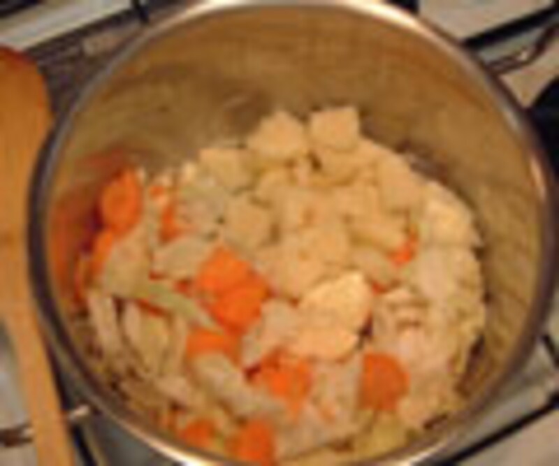 野菜を入れるたびに、焦げないようにざっとまぜて、すぐに鍋のふたをして水分を逃がさない“蒸し煮”にするのがコツ。