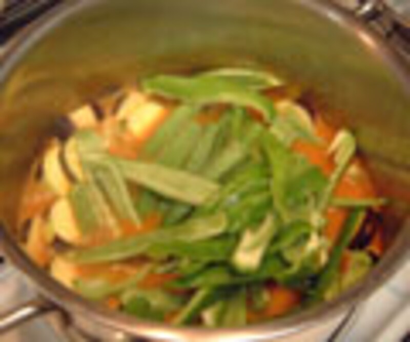 途中、なすや、青い夏野菜、ピーマン・オクラなどを加えて、さらに好みの時間、5~10分程度火を通して、最後に塩(小さじ2~3)で味を整えて出来上がり。