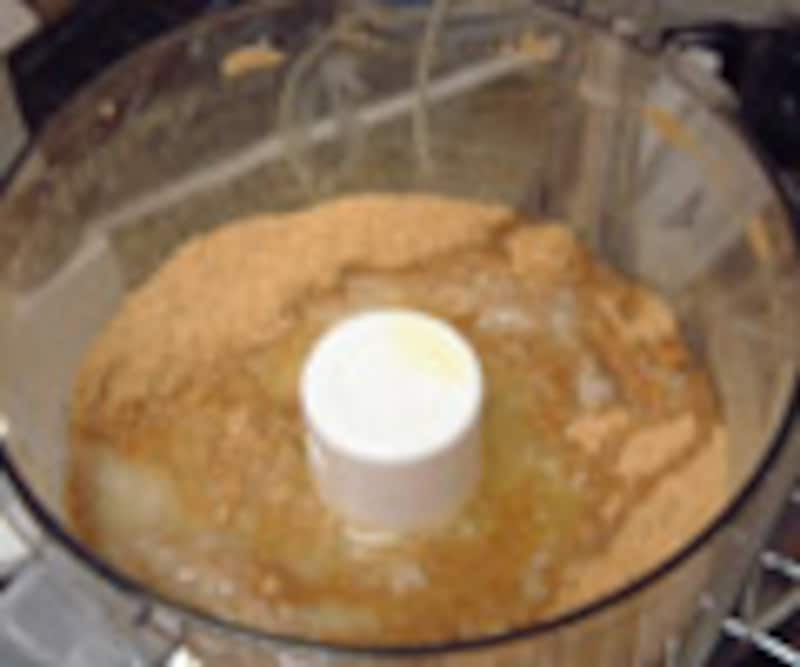 フードプロセッサーの場合は、溶けたバターを直接プロセッサーに加えて、そのままクラッカーとフードプロセッサーにかければよい。