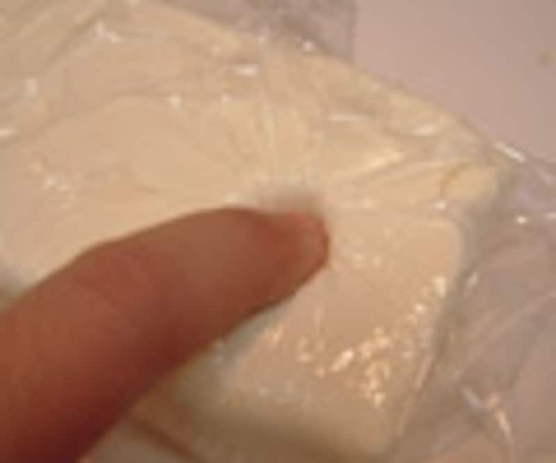 4.冷蔵庫から出したクリームチーズを、ラップで包み電子レンジ(弱)に、2~3分ほどかけて柔らかくする。目安は、全体が温かくなって指で簡単にチーズがへこむぐらい。電子レンジによって出力が違うので、最初は確認しながらするとよい。