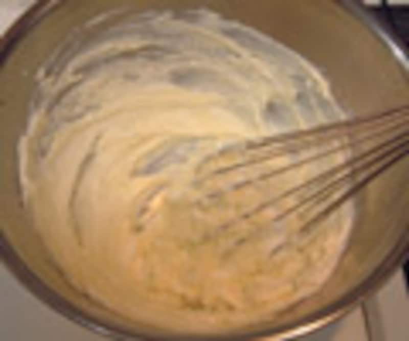 このあたりから、ようやく全体が液体状になり、それほど力を入れなくても混ぜられるようになる。ただし、“泡立て”た状態にならないように、あくまでなめらかに混ぜるようにするといい。