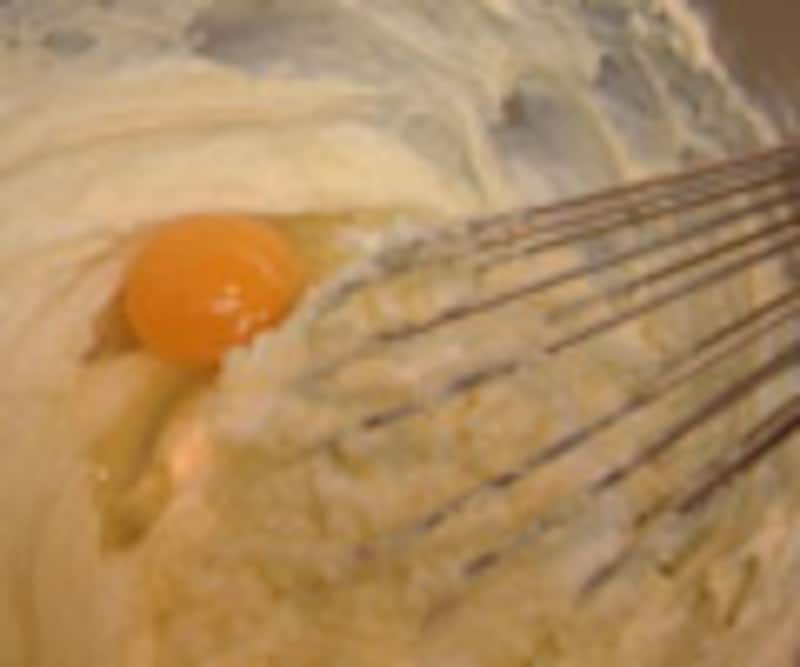 8.卵を1個づつ加え、都度なめらかになるように混ぜる。