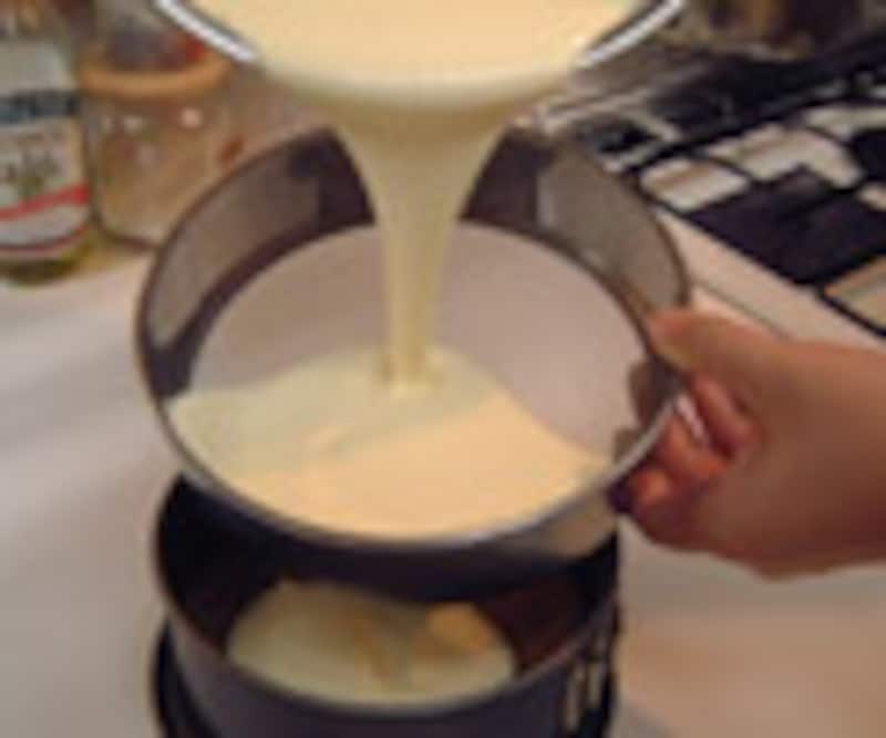 10.全体がなめらかになったら、濾し器か、なければ金ザルで生地濾しながら、クッキー生地を敷いたケーキ型に入れる。入れ終わったら、軽くトントンとゆらして気泡抜きをするといい。