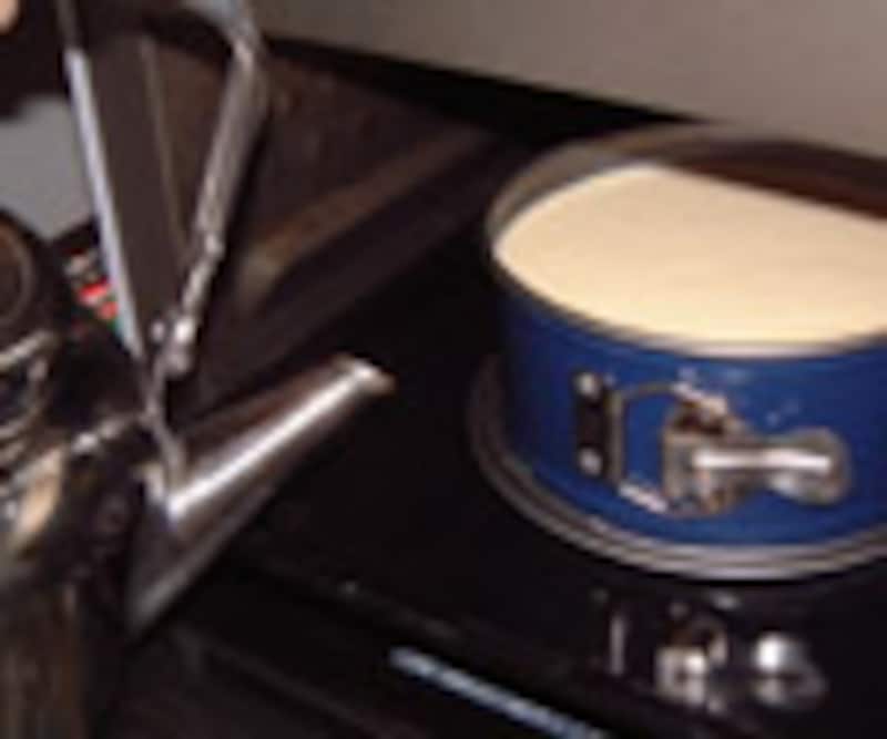底板が外れるタイプのケーキ型の場合は、お湯が中にしみ込んでしまう場合があるので、必ずケーキ型の下半分程度をアルミホイルで包むようにしてお湯が直接型に触れないようにする。