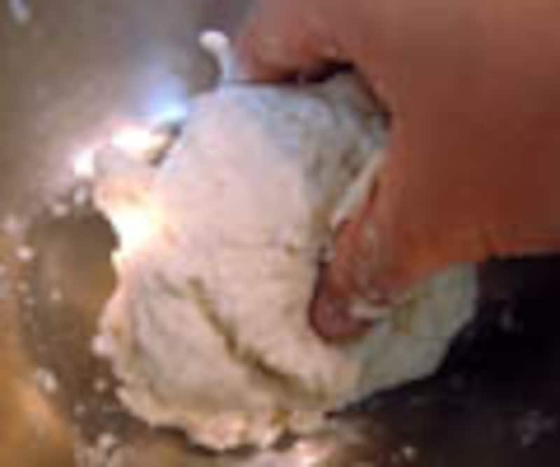 4.20分程度休ませると、生地にねばりが出てきて、全体が滑らかな感触になり、とてもこねやすくなる。