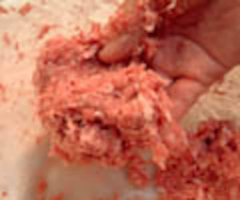 豚は肩ロースの塊を用意し、大豆程度の大きさに細かく切ってから包丁で叩き、ボウルに入れる。