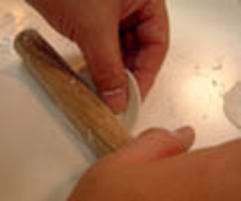 10.円盤状になった皮を、のし棒で伸ばしていく。