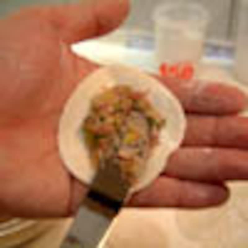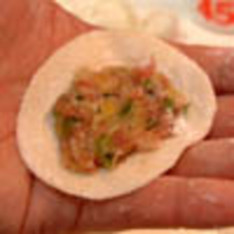 ・皮のフチ5mm程度残して、ややこんもりとのる程度の分量。何個か包んで、ちょうどいい具の分量をつかむといい。皮のフチに具がつくと、最後閉じるときにくっつかなくなる場合があるので注意する。