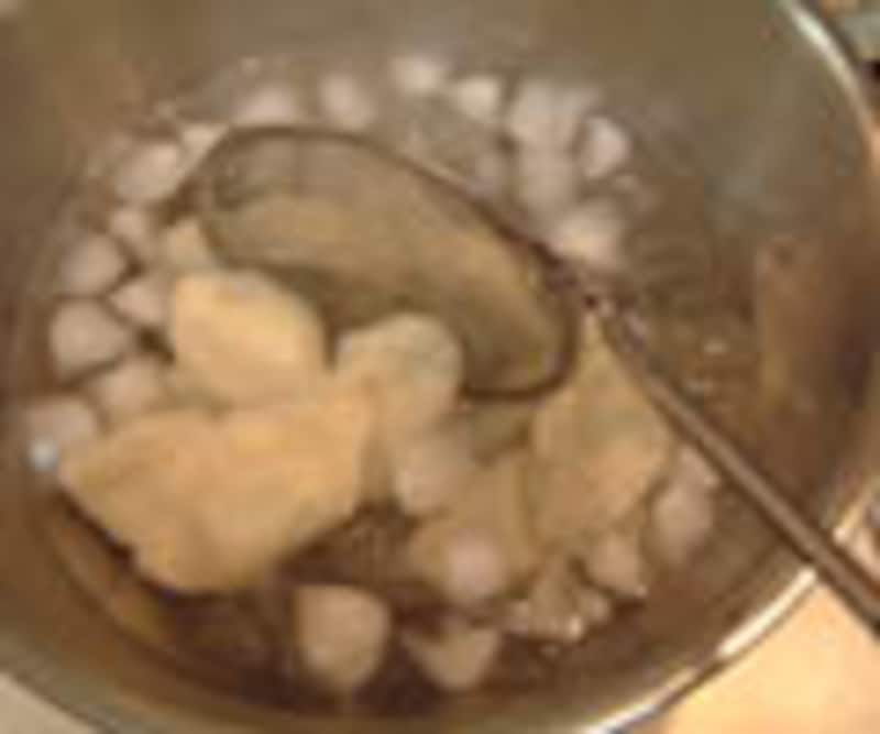 差し水でもいいのだが、一番いいのは、浮いてきた水餃子を、一気に氷水につけて、しめてから再度沸騰したお湯に戻す方法だ。