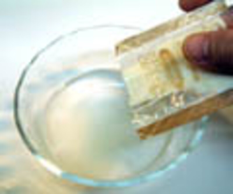 4.水40ccを容器に入れ、そこに粉ゼラチンを振り入れて、ふやかしておく。 軽く混ぜておくとよい。