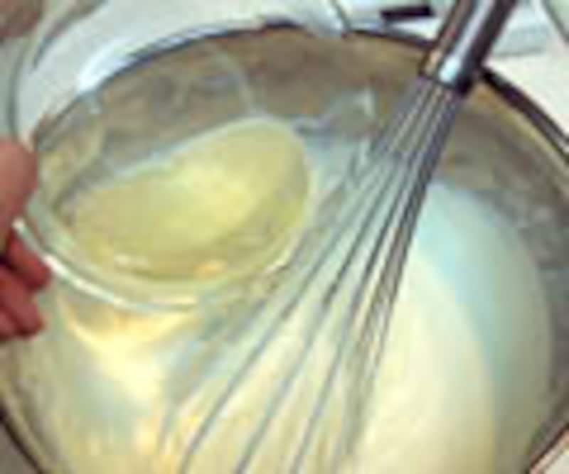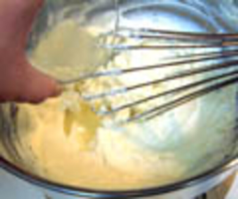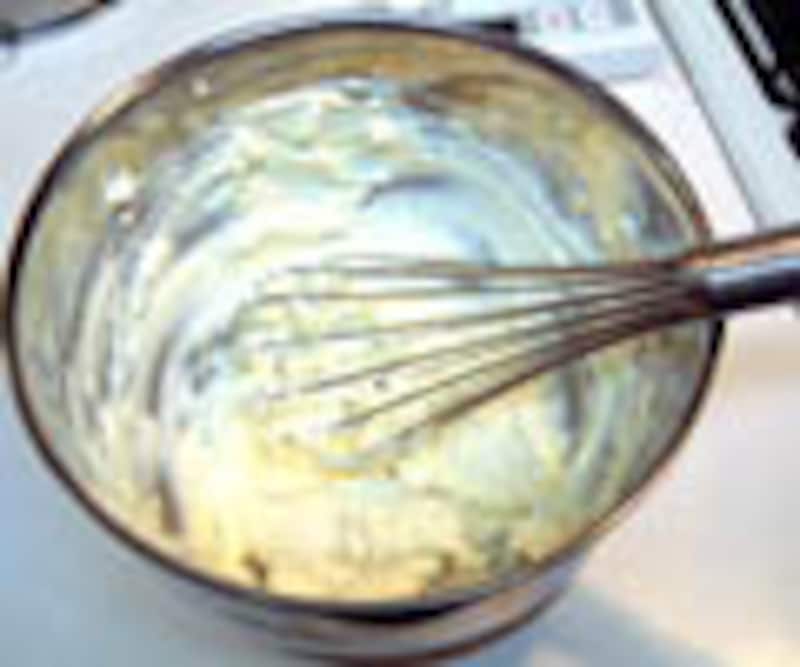 このあたりから、全体がなめらかなクリーム状になり、ラクに混ぜられるようになる。 ボウルの底やホイッパーについた混ざっていない生地などを、ゴムべらなどで混ぜ込みながら、泡立てないように生地を混ぜていく。