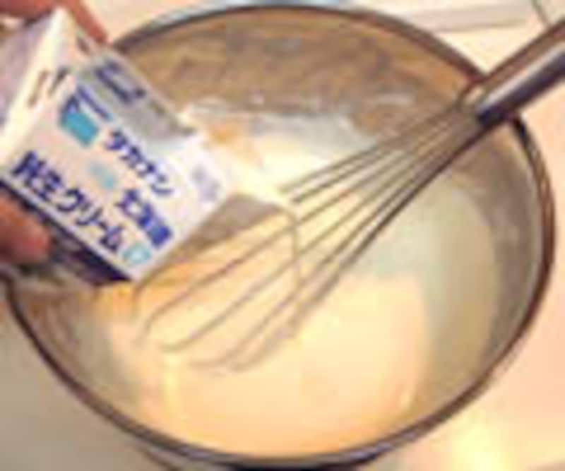 9.ヨーグルトに続いて、生クリームを入れ、さらに混ぜていく。 いずれも2、3回にわけて加えていくと、スムーズにいく。