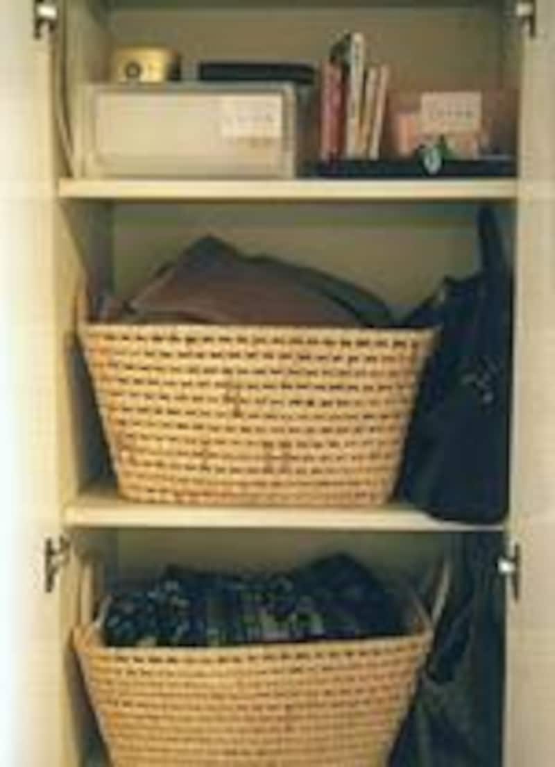 そしてバッグは、収納の一部を専用に空けて設置しました。上のカゴがトーチャンの部屋着&通勤カバン置き場、下のカゴがガイドのです。さらに上の棚には、トーチャンの通勤グッズや、ガイドの財布に入ってたレシートを入れる箱などを置くようにしました。これで、食卓の上や財布の中もいつもスッキリ。このスペースには以前、本や手芸用具が入っていたのですが、結構無理やりこのスペースを作ったことにより「帰宅直後の散らかり」は激減しましたよ。散らかりの連鎖は元から断つ!