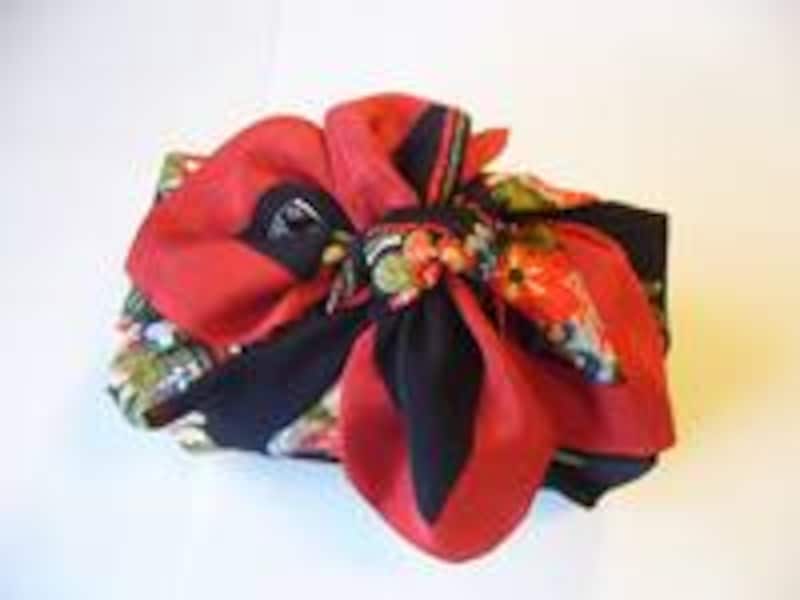 重ねた結び目が、花のように見えます。四隅に色柄のある風呂敷がベター。ケーキを包むのにピッタリです。