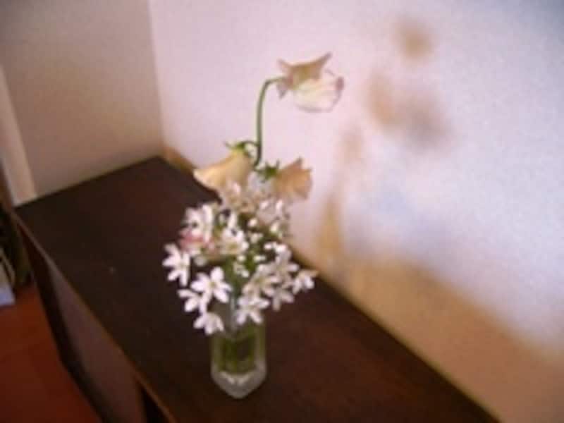 飾り物は、数枚の絵のほかには、生花だけ。それも、あまりゴージャスな花束ではなく、ひかえめで可愛らしい花を。一輪だけでもOK。