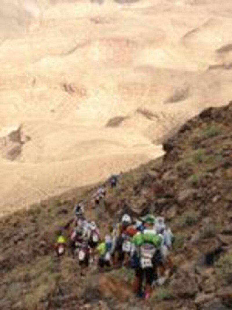 | ナミビア・フィッシュリバーキャニオン、世界で2番目に大きな渓谷。急勾配の坂や川、崖のぼりと変化に富んだコースでしかもとても暑く、初日にしてリタイア者続出。たった15キロでトップとラストランナーの時間差はなんと6時間(峯澤)。(c)m.minezawa |