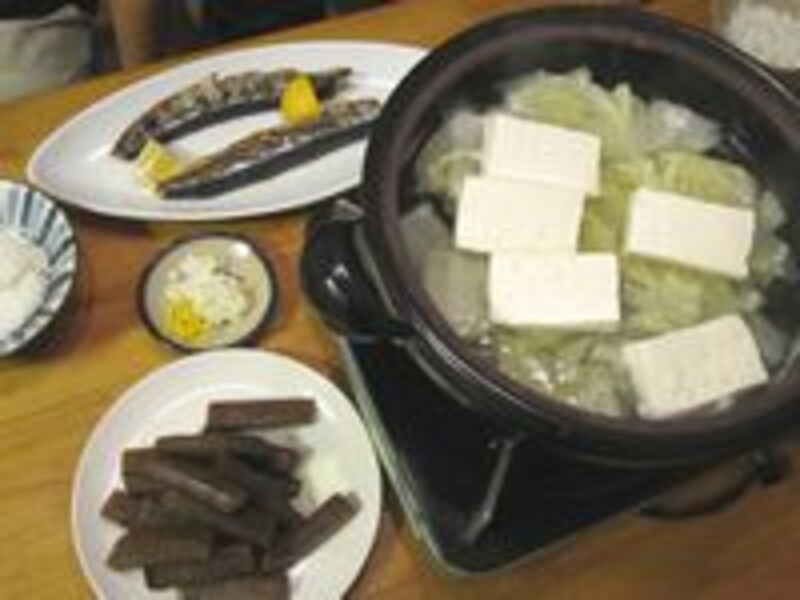 | 夕食は、今年初めての湯豆腐、さんま、キャベツの浅漬け、こんにゃくの醤油煎り |