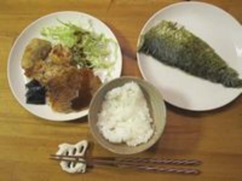 | 夕食は、さばの竜田揚げ(先週作って冷凍しておいた)、れんこんのお焼き、昆布の佃煮(昨日の湯豆腐の昆布で作った) |