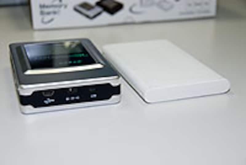 | Memory Bank(写真左)と、それまで使っていたHDDケース(写真右)。シンプルなHDDケースに比べてずんぐりむっくりした印象は否めない。Memory Bankの本体サイズは奥行き115×幅77×高さ21mm、重さは190g(HDD除く)。それまで使っていたのが奥行き127.5×幅75×高さ13mm、重さ60gだったので、やはり重くなったイメージは強い | |