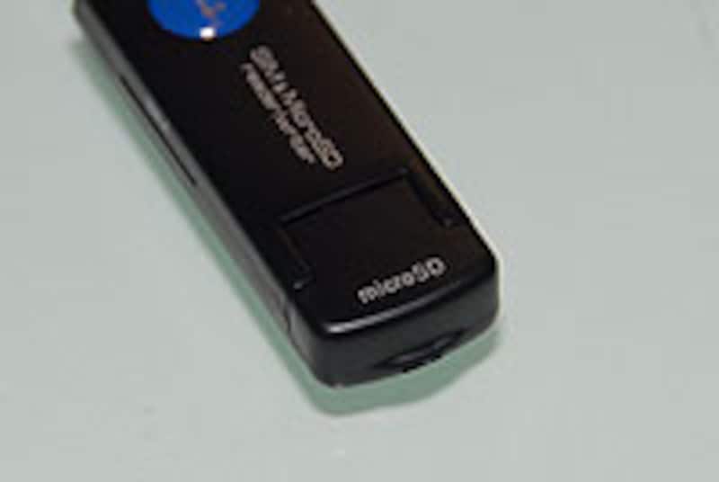 | microSDカードスロットはフタが付いているため、カードを挿入してフタを閉めればUSBメモリーとして全く違和感なく使える | |
