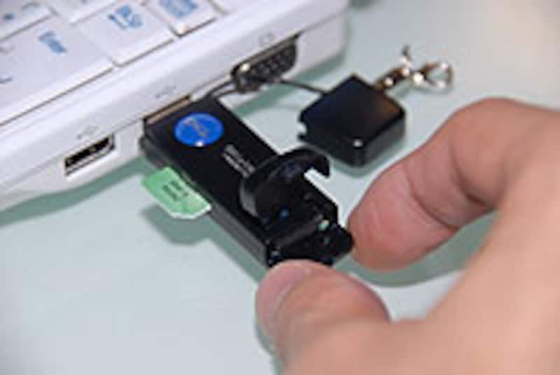 | FOMAカードを挿入したところ。microSDカードとは違って出っ張ってしまうが、挿しっぱなしにすることはまずないので実用上の問題はない | PCのUSB端子に接続してから、付属のSIMカード編集ソフト「SIM card editor 3.0」を起動 |
