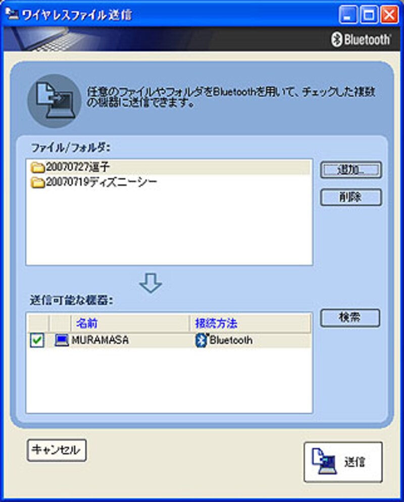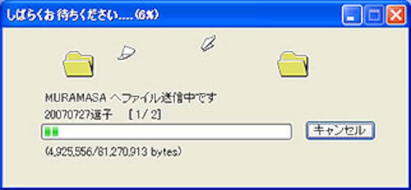 | 「ワイヤレスファイル送信」機能を利用し、デスクトップPCからノートPCにファイルを送信してみた。規格上は最大3Mbpsだが、実際の速度は1Mbps程度だった |