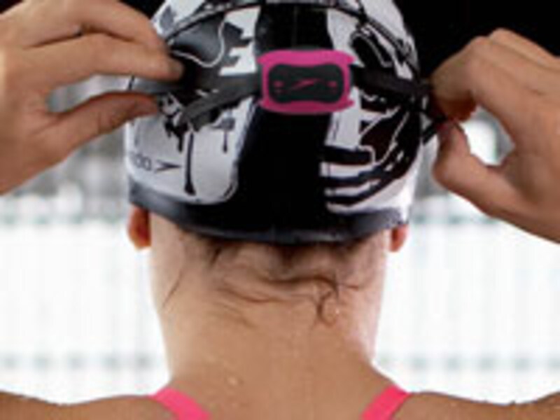 AquabeatはIPX5/IPX7相当の防水性能を備えており、水深3mまでの利用が可能。本体サイズは幅61×高さ46×厚さ20mmで、重さは約35gだ。カラーバリエーションはブラック、ライム、ピンクの3色を用意しており、スイムウェアやゴーグルと合わせられる。ゴーグルのバンドに留められるようなスタイルで、万が一落としても水に浮く仕様になっているのがうれしい。もちろん付属のヘッドホンも防水タイプで、外れにくいように耳かけ型になっている。