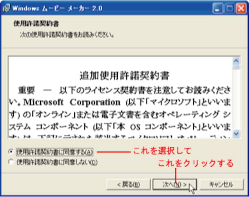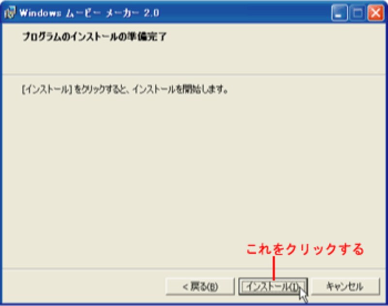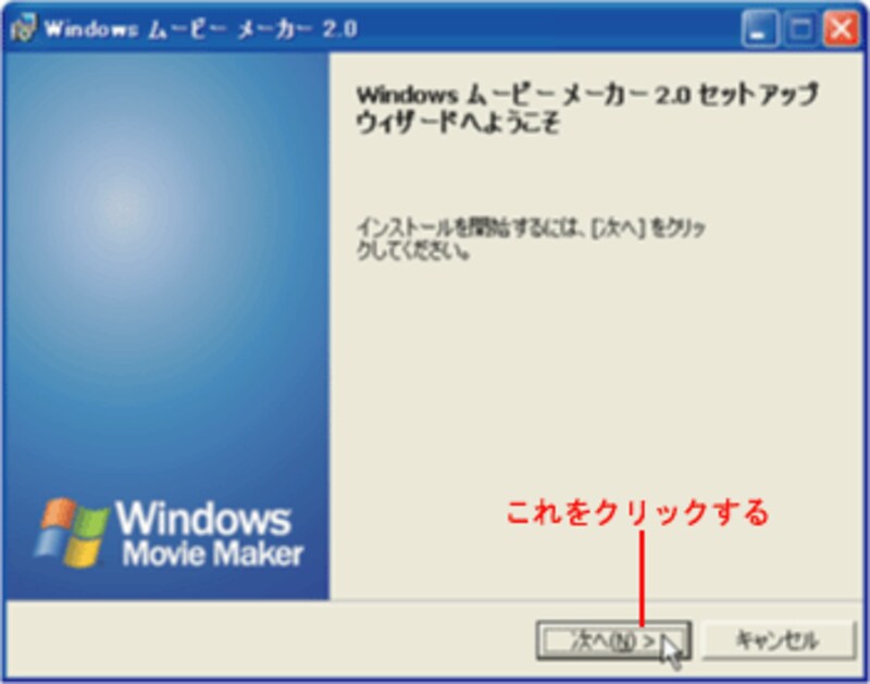 ムービーメーカー2のプログラムファイルが入手できたら、プログラムのアイコンをダブルクリックしてください。インストール用のプログラムが起動され、ウィザードが表示されます。あとは、表示されるメッセージにしたがって作業を進めてください。