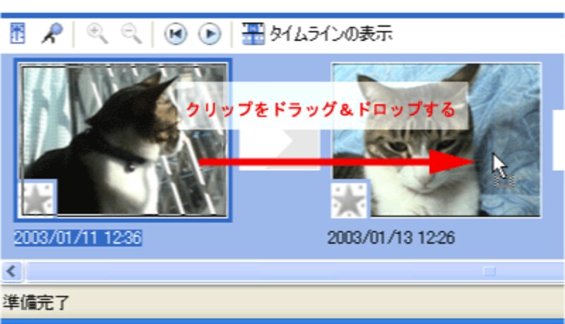 順番を入れ替えたいクリップを、タイムライン上でドラッグ&ドロップします。これで、クリップの順番が入れ替わります。また、同じようにドラッグ&ドロップすれば、元に戻すことができます。