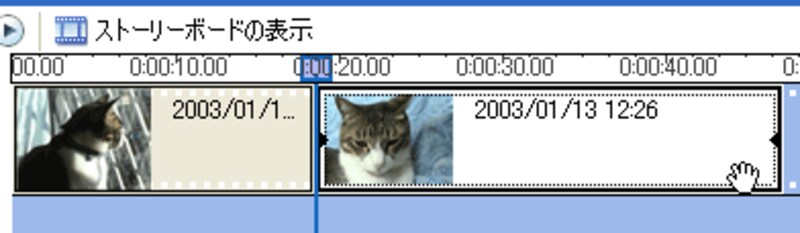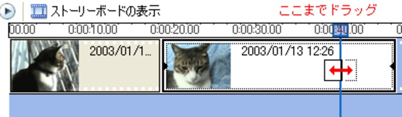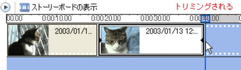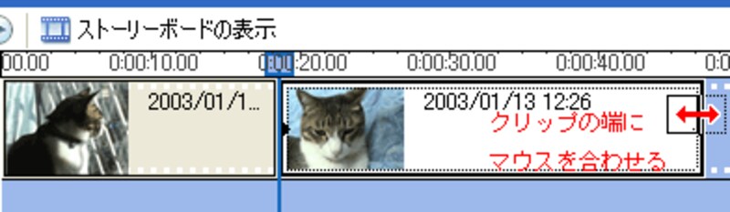 ビデオクリップの先頭や最後にマウスを合わせると、マウスカーソルの形が矢印に変わります。そのままマウスを左右にドラッグすると、クリップの始点と終点が変わりますが、これによって、表示したくない映像部分をカットしたことになります。たとえばクリップの最後を左にドラッグすると、ドラッグした部分が表示されなくなります。