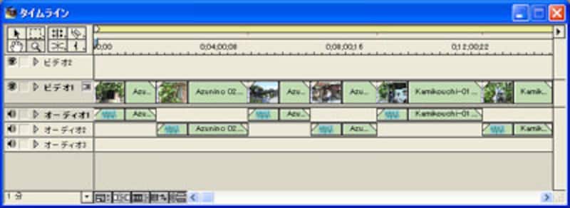 では、「タイムライン」というのは何なのかということですが、タイムラインというのは「時間の線」と訳せますね。ビデオ編集では、たとえば5秒や10秒といった長さの映像データを並べることで1本のムービーを作成します。このとき、映像データを並べたものを「タイムライン」と呼んでいます。