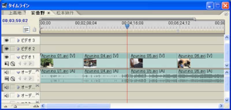 ところで、複数のタイムラインが利用できると何が便利なのかというと、長いムービー作成が簡単になるとういことです。たとえば、「信州旅行」というムービーを作るとしましょう。このとき松本市内や安曇野、そして上高地などを旅行したとすると、シーンとしては次のような3つのシーンが作成できます。
