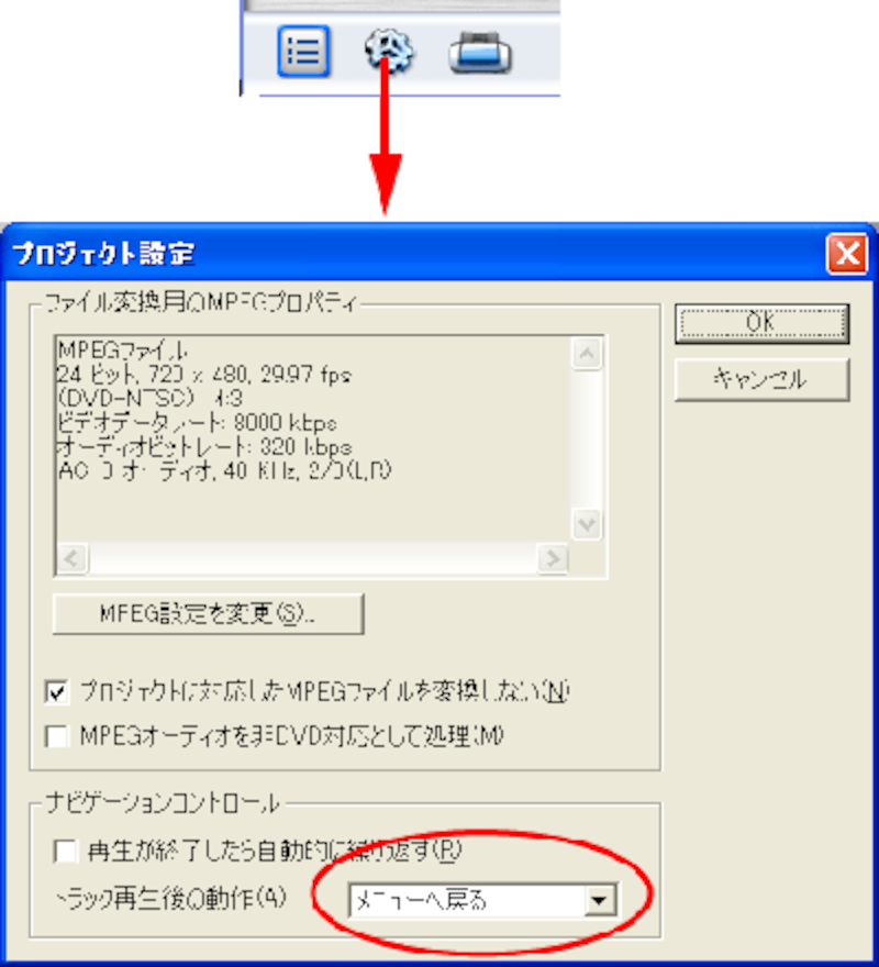 画面左下にある[プロジェクト設定]アイコンをクリックし、「ナビゲーションコントロール」にある「再生が終了したら自動的に繰り返す」をオフにします。ここで、「トラック再生後の動作」を「メニューへ戻る」に設定します。